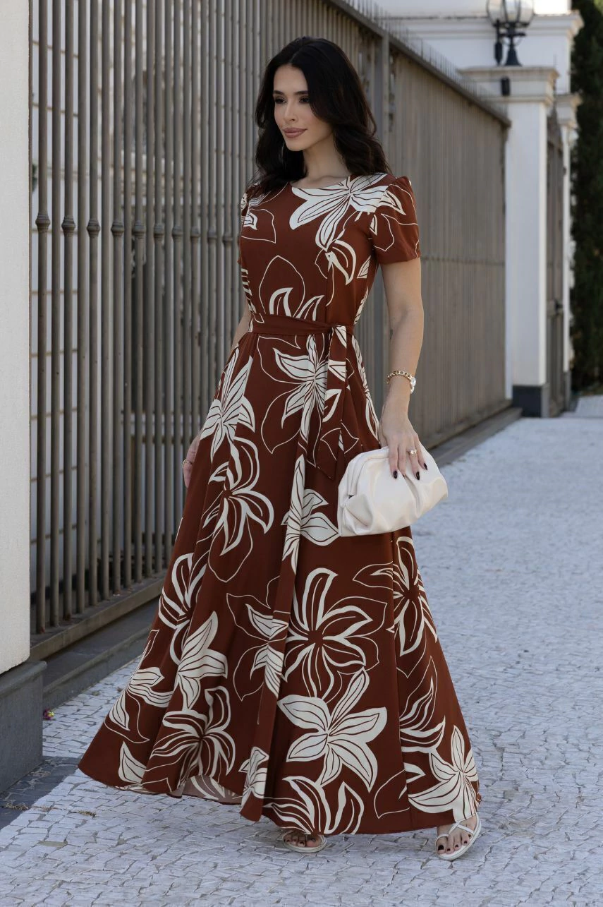 Comprimento Longo, possuí cinto faixa do mesmo tecido, forro e fechamento de zíper nas costas.