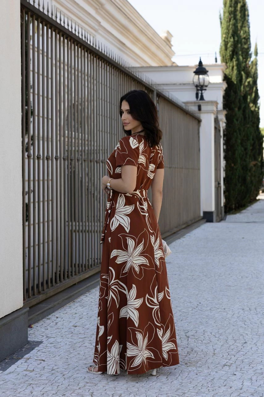 Confeccionado no tecido Crepe estampado tecido leve e fluído. Decote arredondado e mangas princesa.