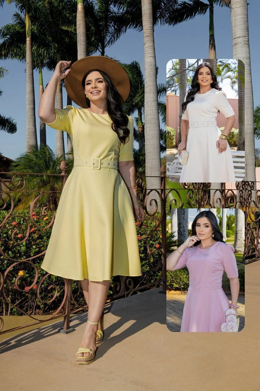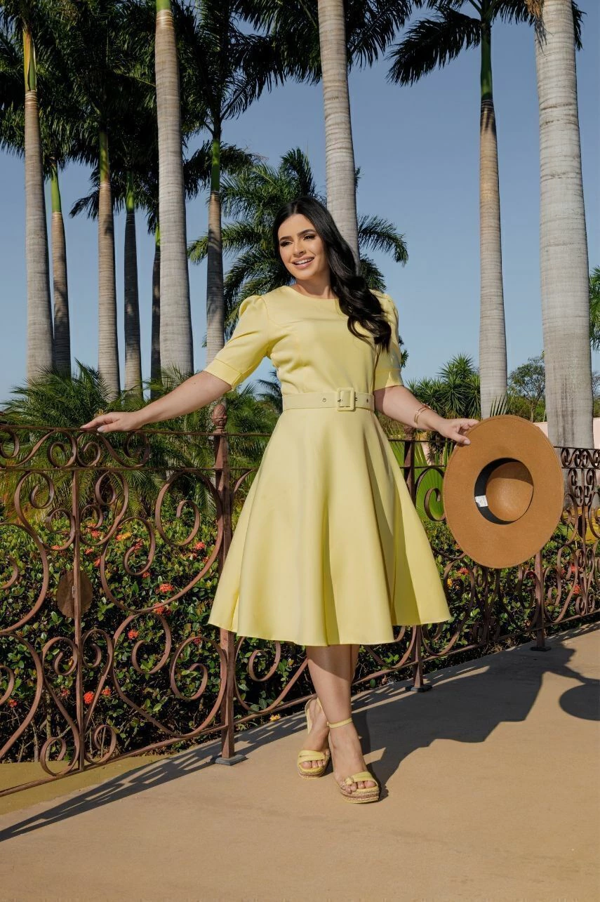 Com decote arredondado e mangas franzidas com punho, o modelo valoriza a parte superior com charme e delicadeza. O comprimento midi garante elegância em qualquer ocasião, e o forro interno com zíper nas costas entrega praticidade e acabamento de qualidade.